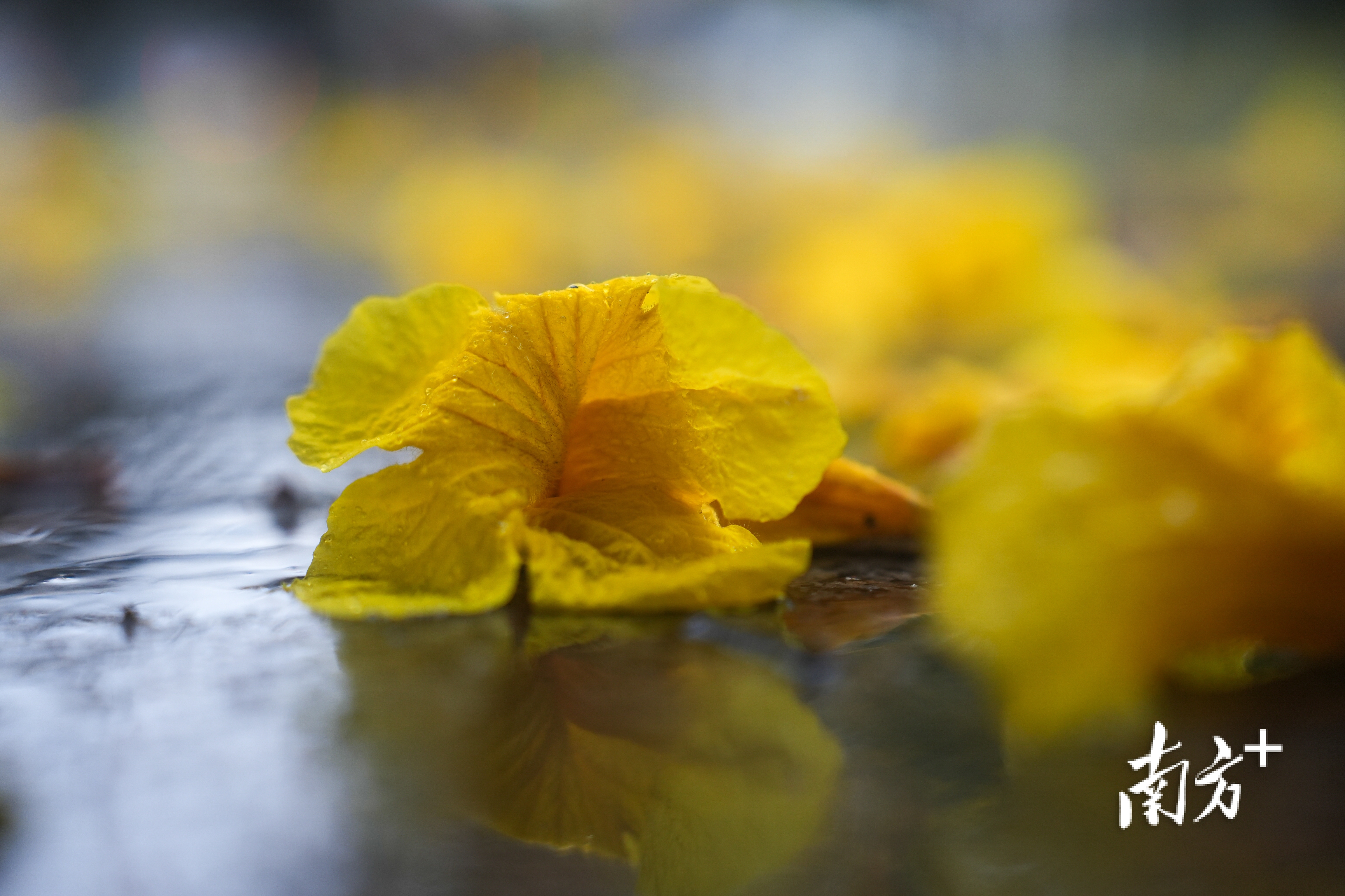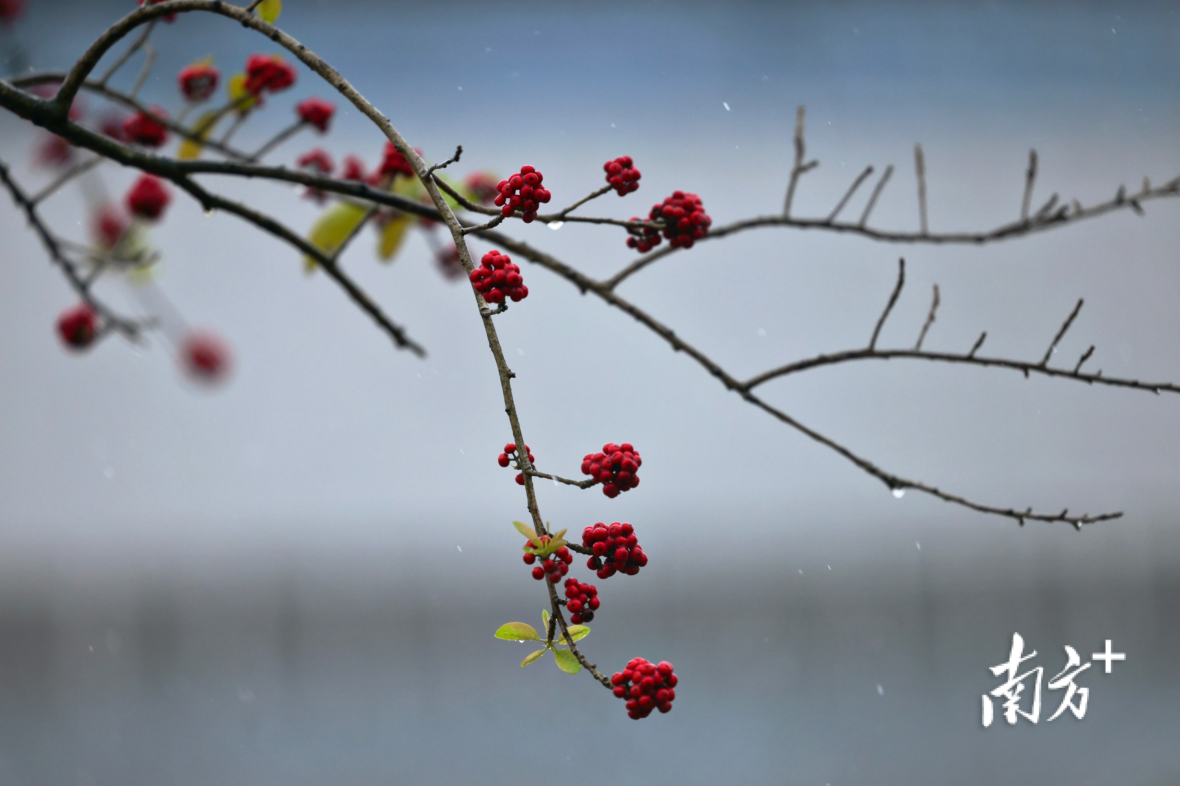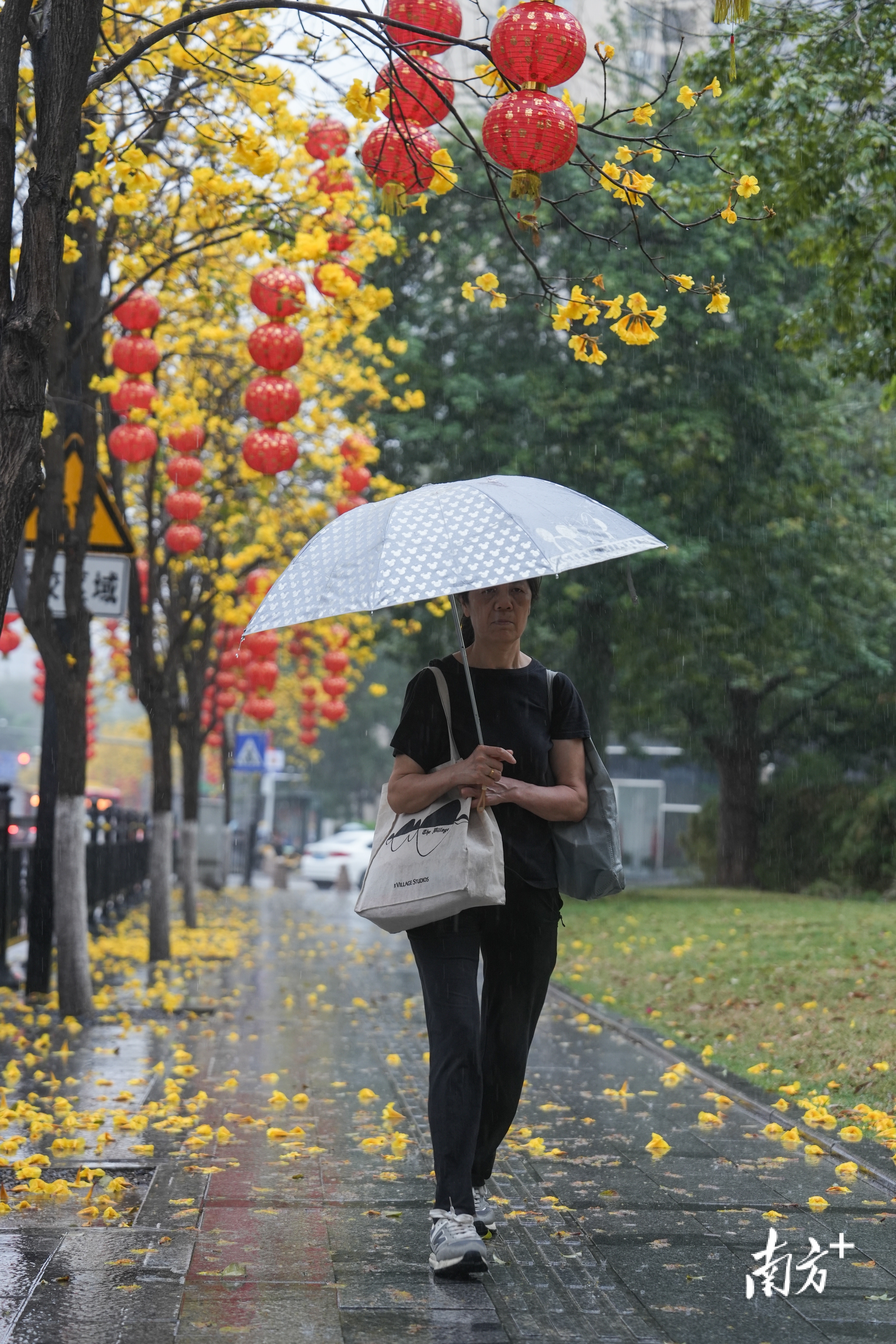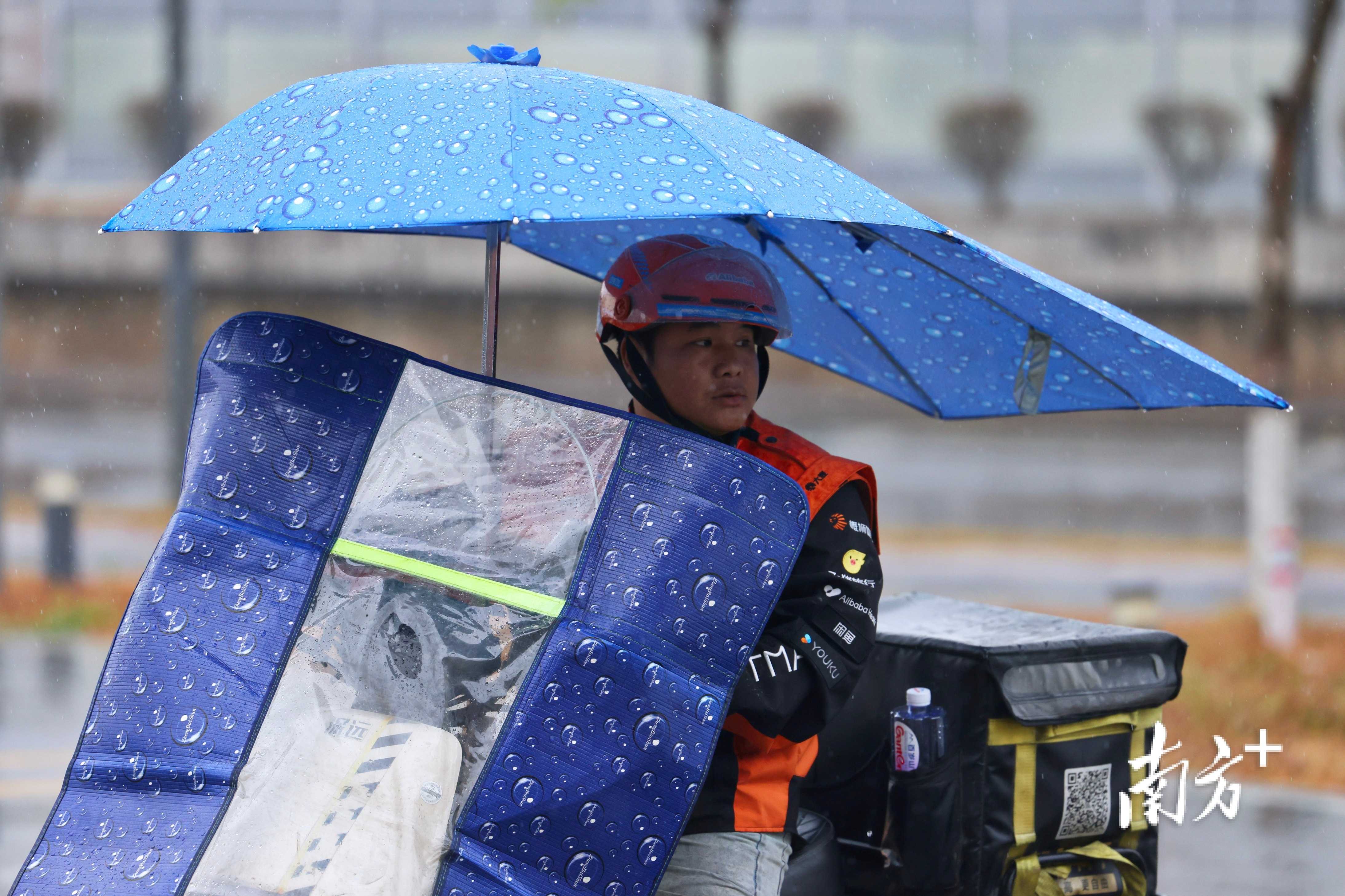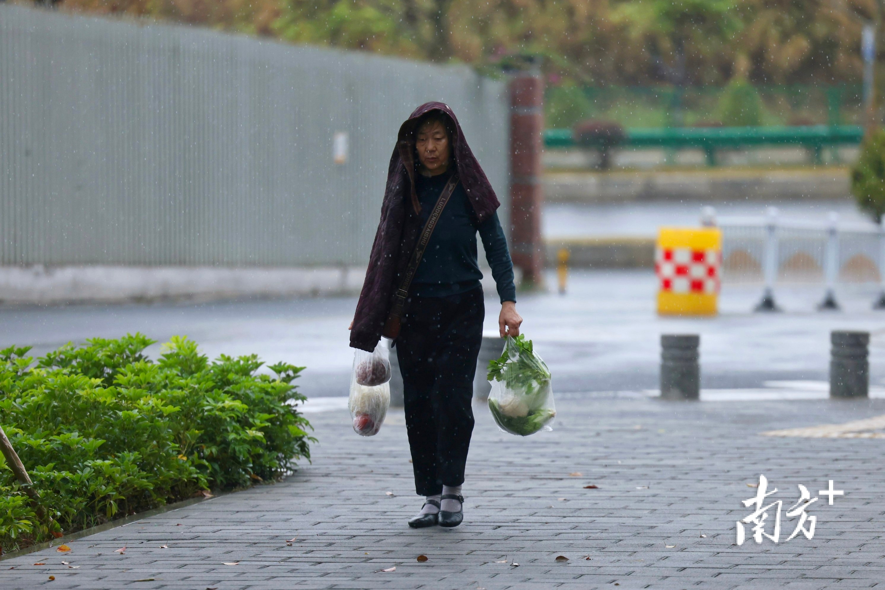 在番禺区兴教路,降雨难挡孩童们奔跑踢球的雀跃身影。返校的大学生与家人一同提着行李,在雨中匆匆前行。道旁树梢新结的果实缀满雨珠,晶莹闪烁。