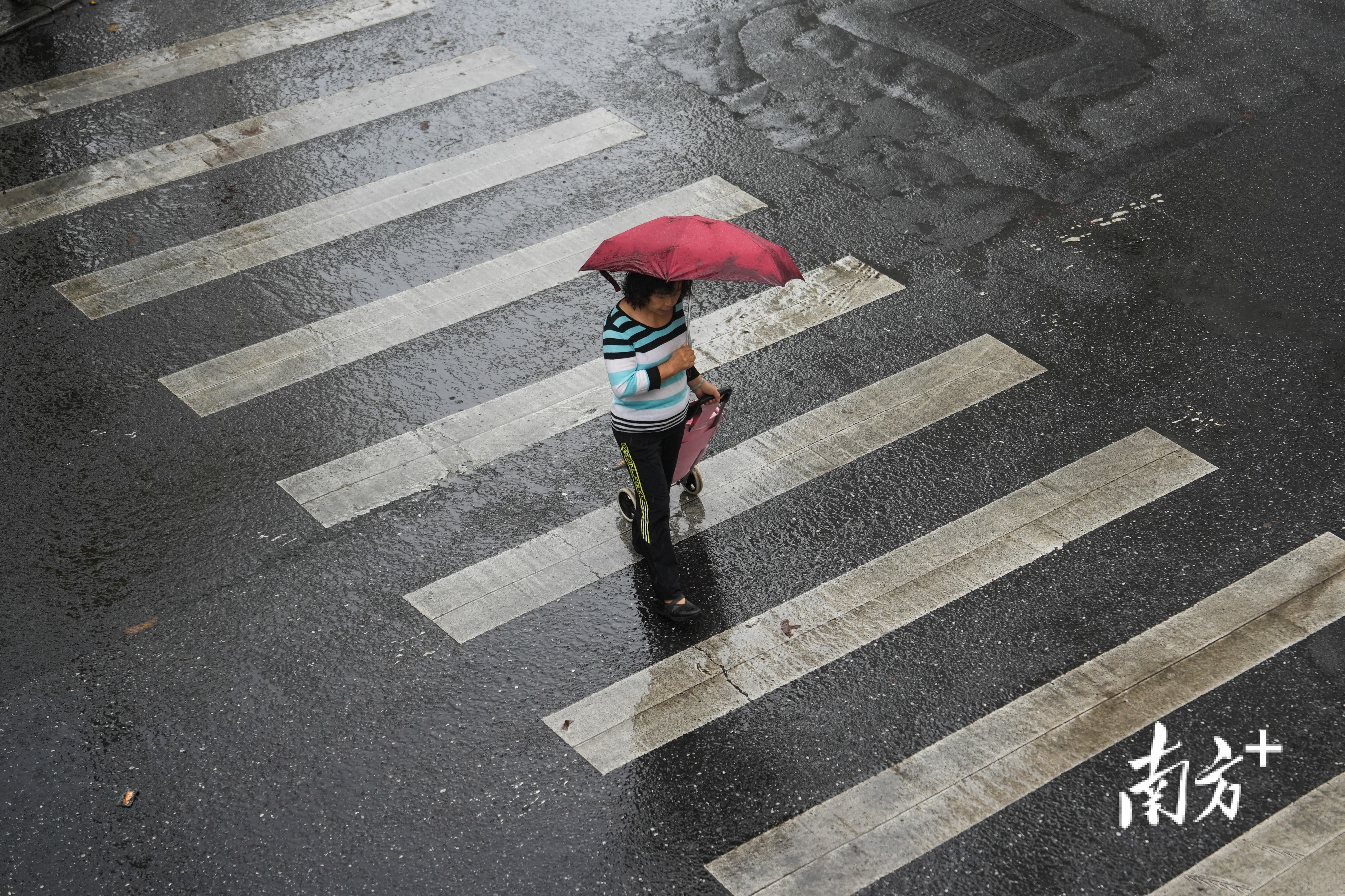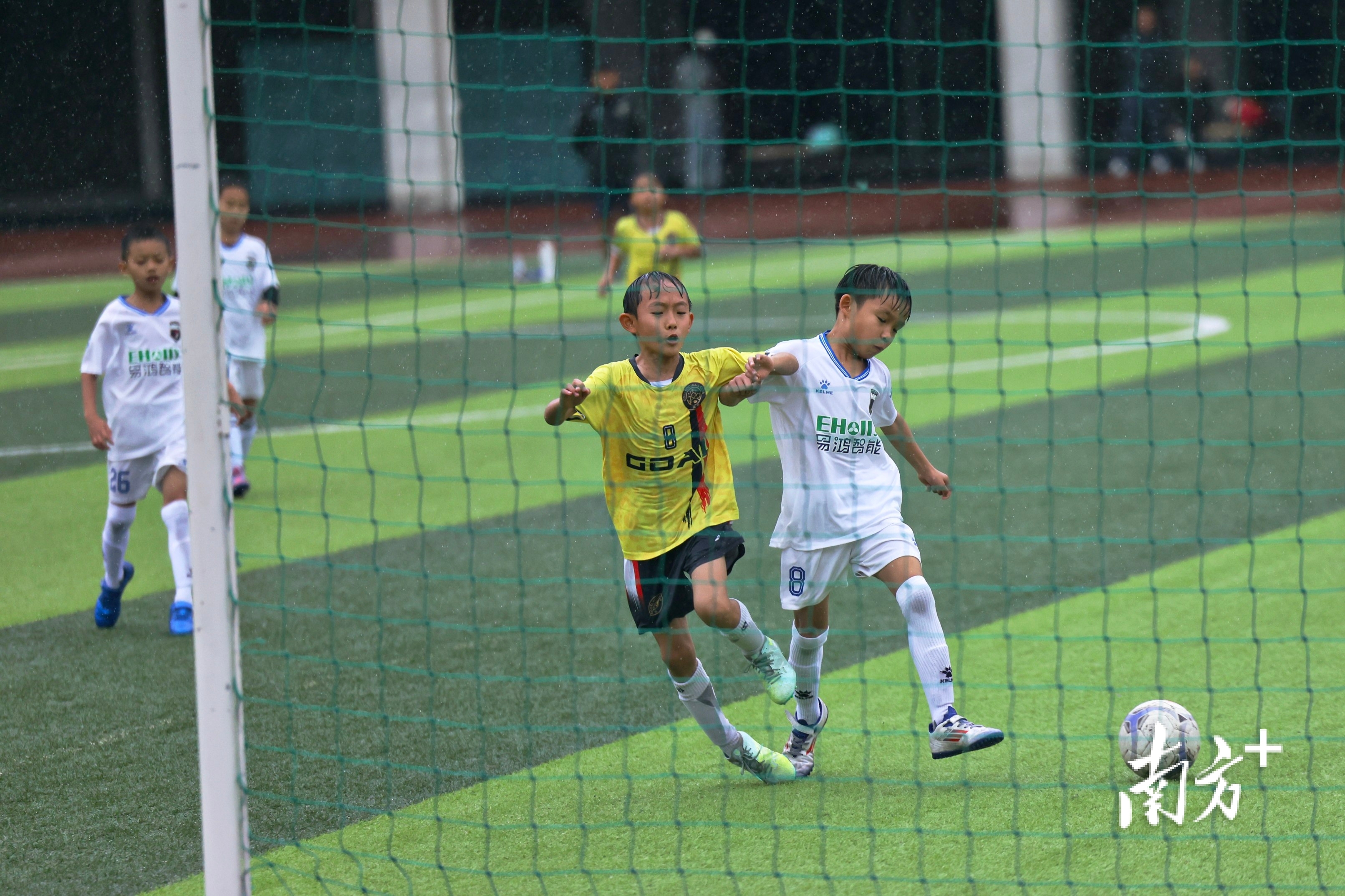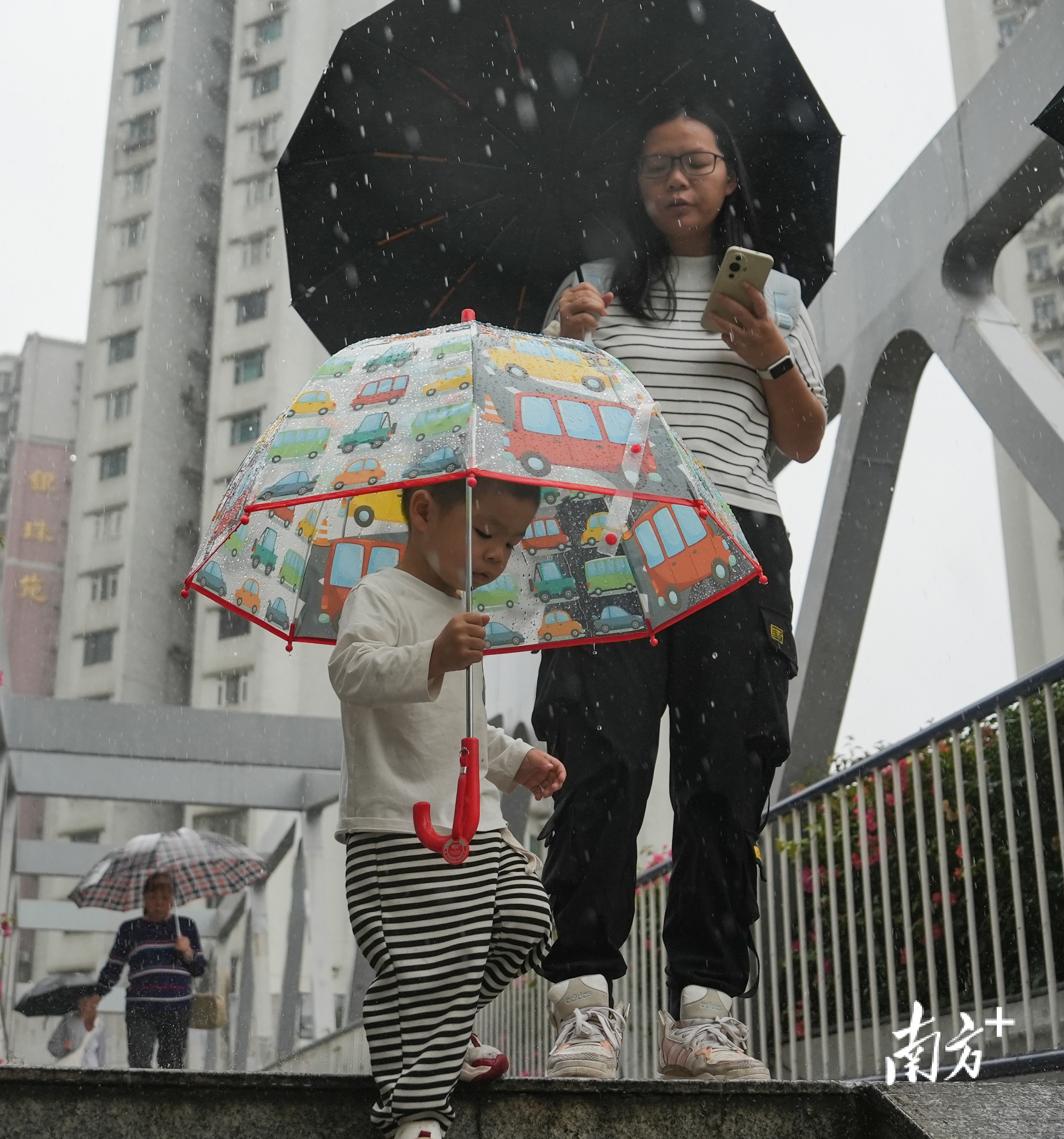 暴雨洗羊城:雨中赶路的行人与踢球雀跃的孩童
